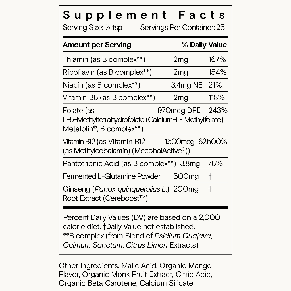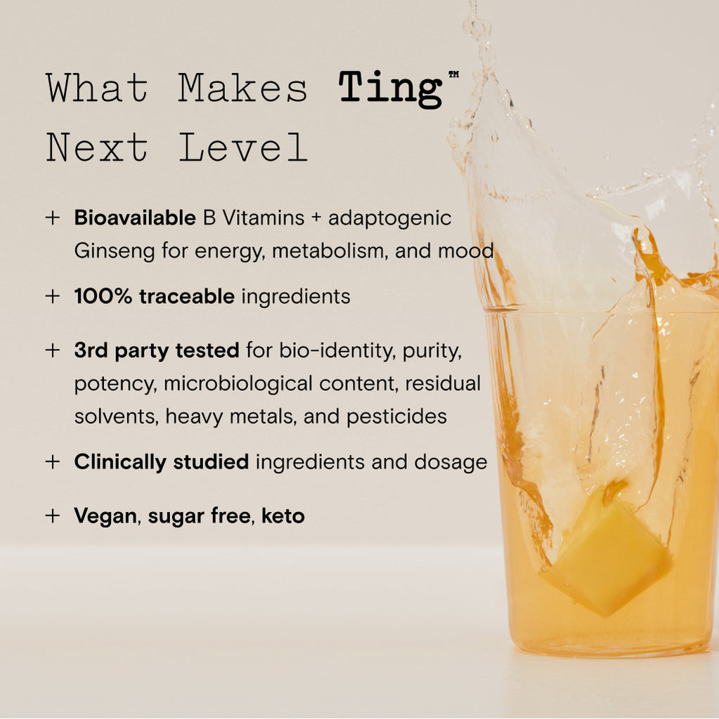 Ting contains higher doses of B Vitamins that were carefully sourced to ensure sustainability and bioavailability. Our B-Complex is extracted from Organic Guava and Tulsi grown on a farm in Southern India. Our B12 uses an environmentally friendly methylation agent that is safe and non-toxic. Ting also has the added benefit of adaptogenic Ginseng to support cognitive function.